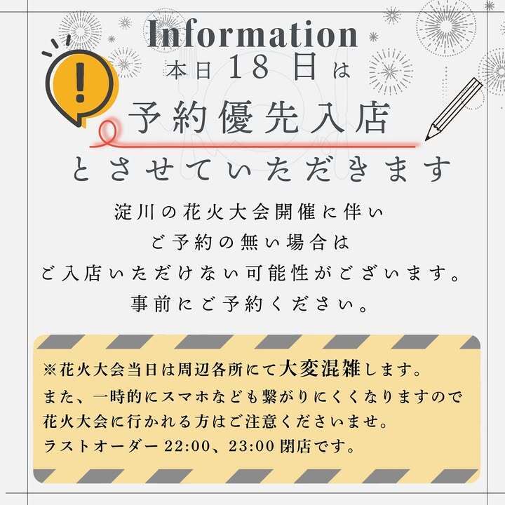 ご予約の無い場合はご入店いただけない可能性がございます。事前にご予約の上、ご来店いただきますようお願い申し上げます。※花火大会の日は、周辺各所にて交通規制があり