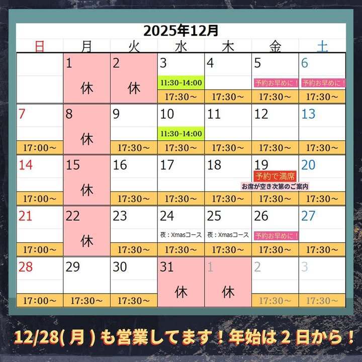 なお、12/24(水)、12/25(木)の事前予約はコース限定です。